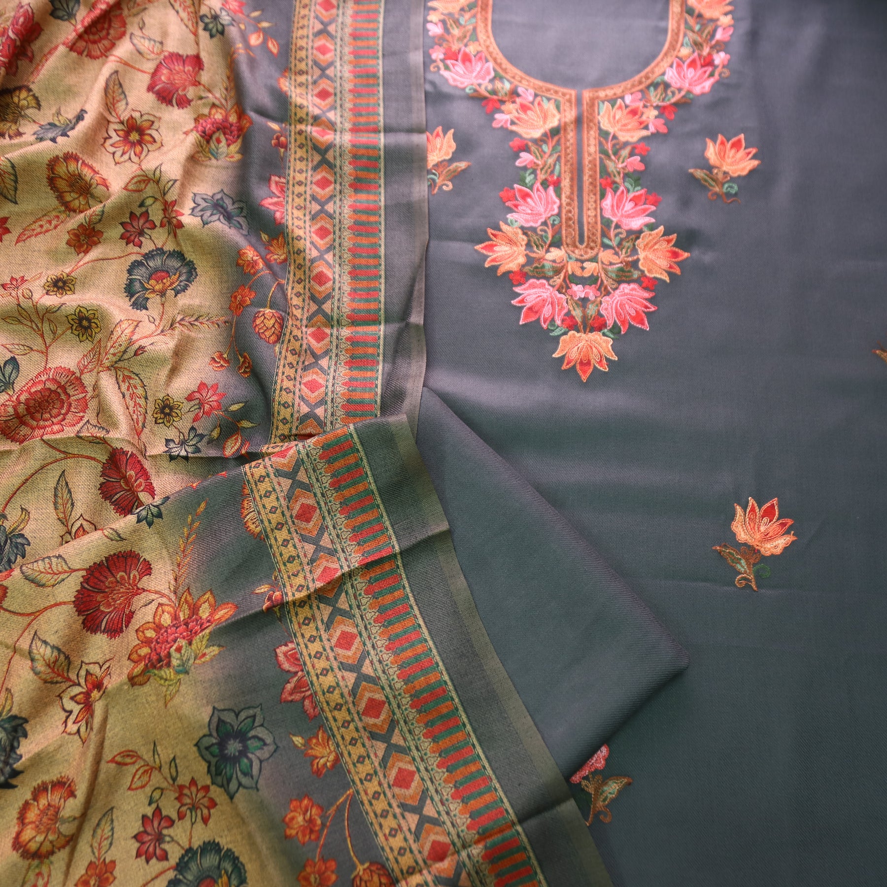 सुनहरी Slate Grey Perfectly Woven Kashida Embroidery Semi Pashmina Winter Set
