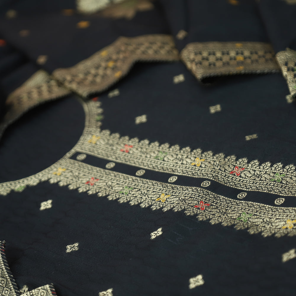 Work- A luxurious semi-pashmina winter set featuring all-over zari weave detailing on the top, paired with a matching plain bottom and a complementing dupatta showcasing the same elegant zari pattern. Perfect for a soft, graceful, and cozy winter look.