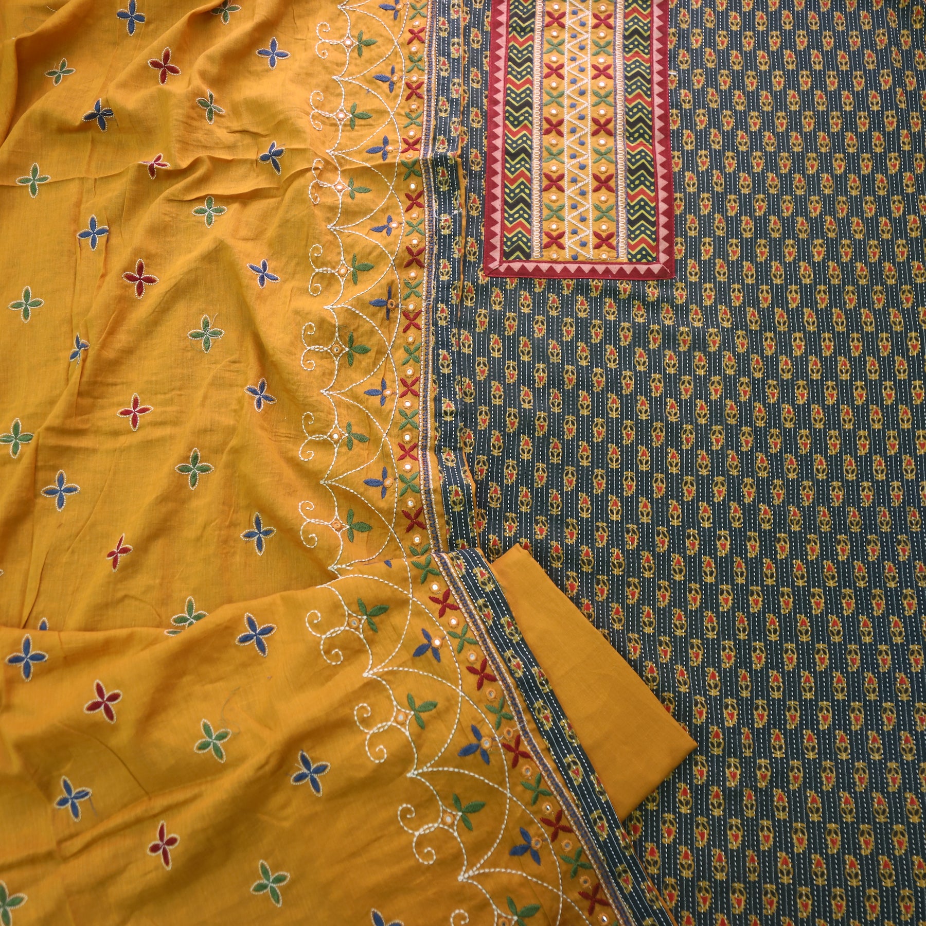 Chandni Grass Green Running Stitch Kutch Patch with ajrak Printed cotton Suit