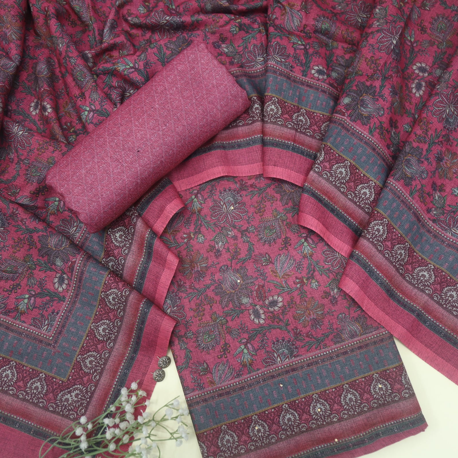 Work-A floral printed semi pashmina top paired with a matching semi pashmina dupatta creates a coordinated and elegant ensemble. The softness of the semi pashmina fabric and the vibrant floral prints make this outfit suitable for various occasions, offering a blend of comfort and style.