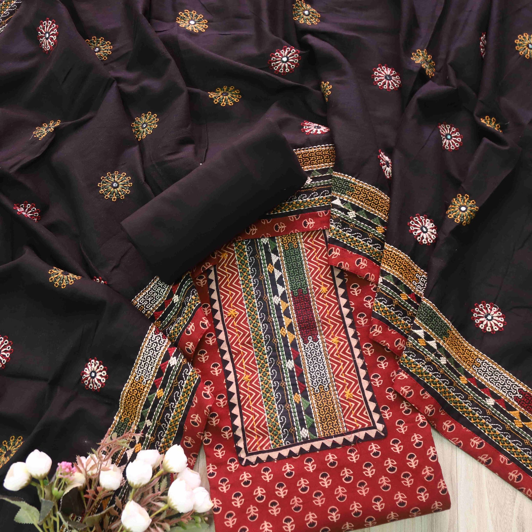 Description- Introducing our Kutch Work Printed Cotton Top, showcasing intricate mirror work along the neckline. Paired flawlessly with a Printed Cotton Dupatta, this ensemble seamlessly blends traditional artistry with modern design. The top's vibrant Kutch work and mirror embellishments harmonize with the dupatta's prints