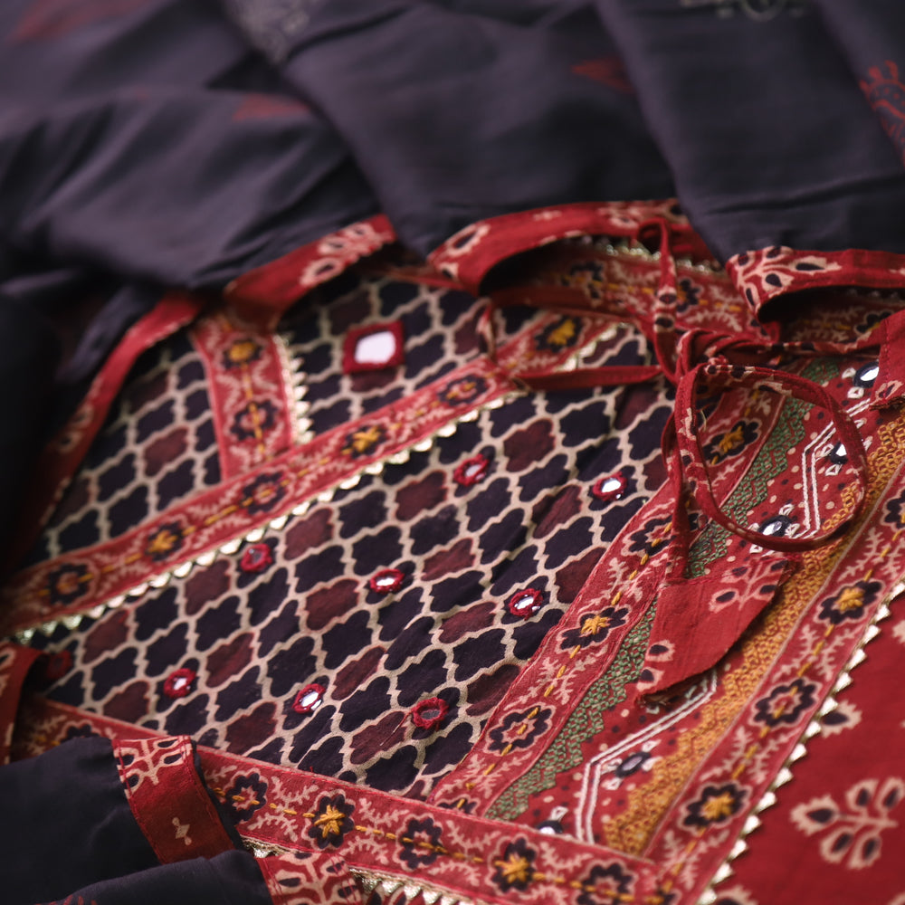 Description- A culturally rich ensemble featuring an Angrakha-style printed cotton top adorned with Kutch work, paired harmoniously with a matching cotton dupatta. This set combines traditional Kutch work with the timeless charm of printed cotton for a stylish and culturally inspired look.