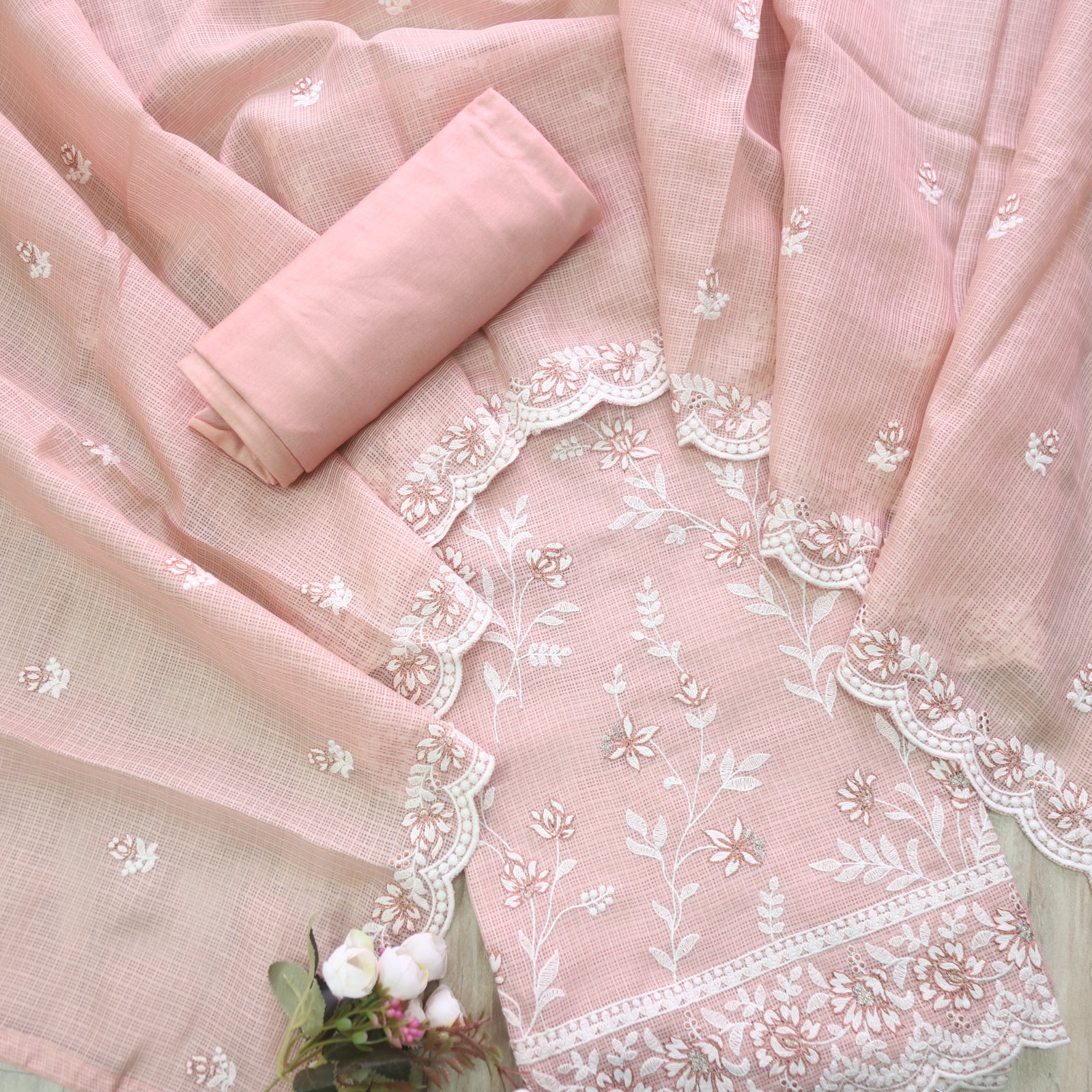 Mahi Peach Orange All Over Thread Embroidered Kota Doriya suit Set