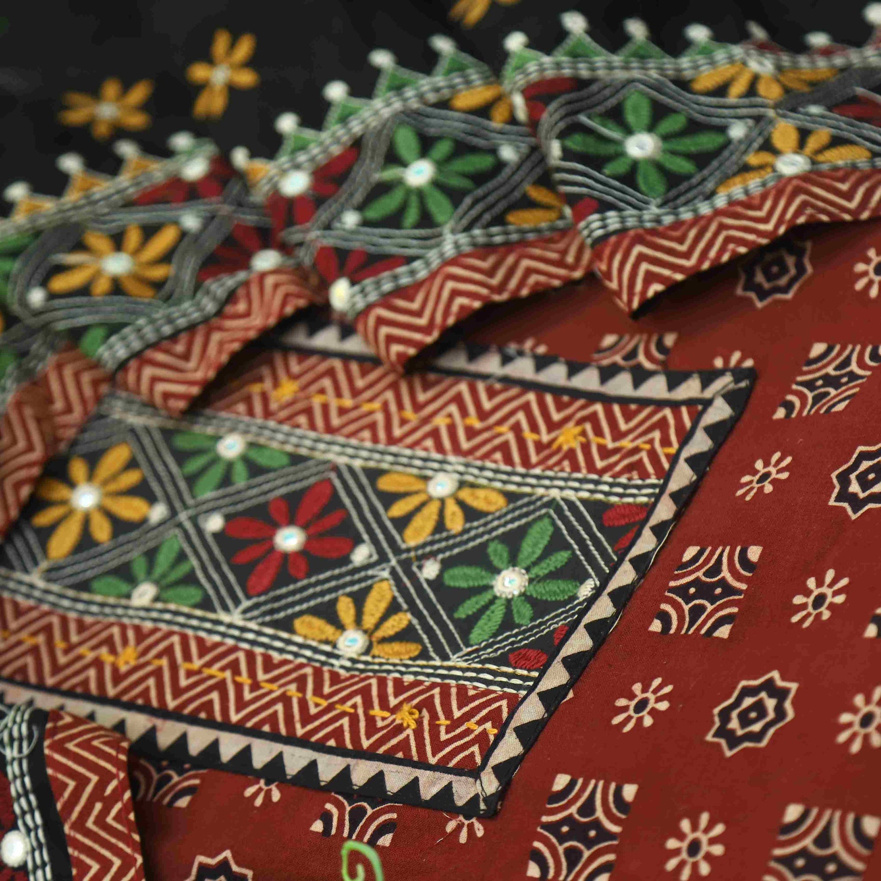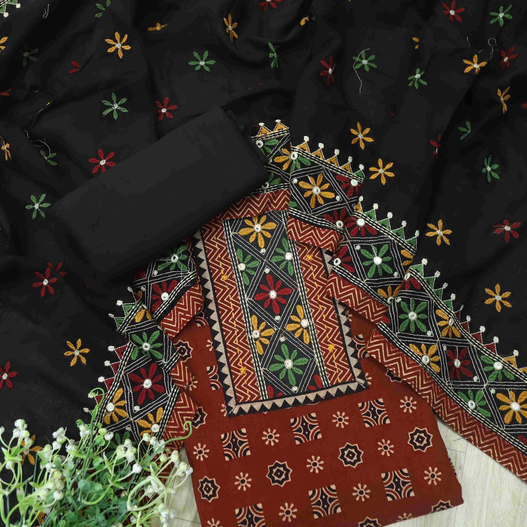 Description- Introducing our Kutch Work Printed Cotton Top, showcasing intricate mirror work along the neckline. Paired flawlessly with a Printed Cotton Dupatta, this ensemble seamlessly blends traditional artistry with modern design. The top's vibrant Kutch work and mirror embellishments harmonize with the dupatta's prints
