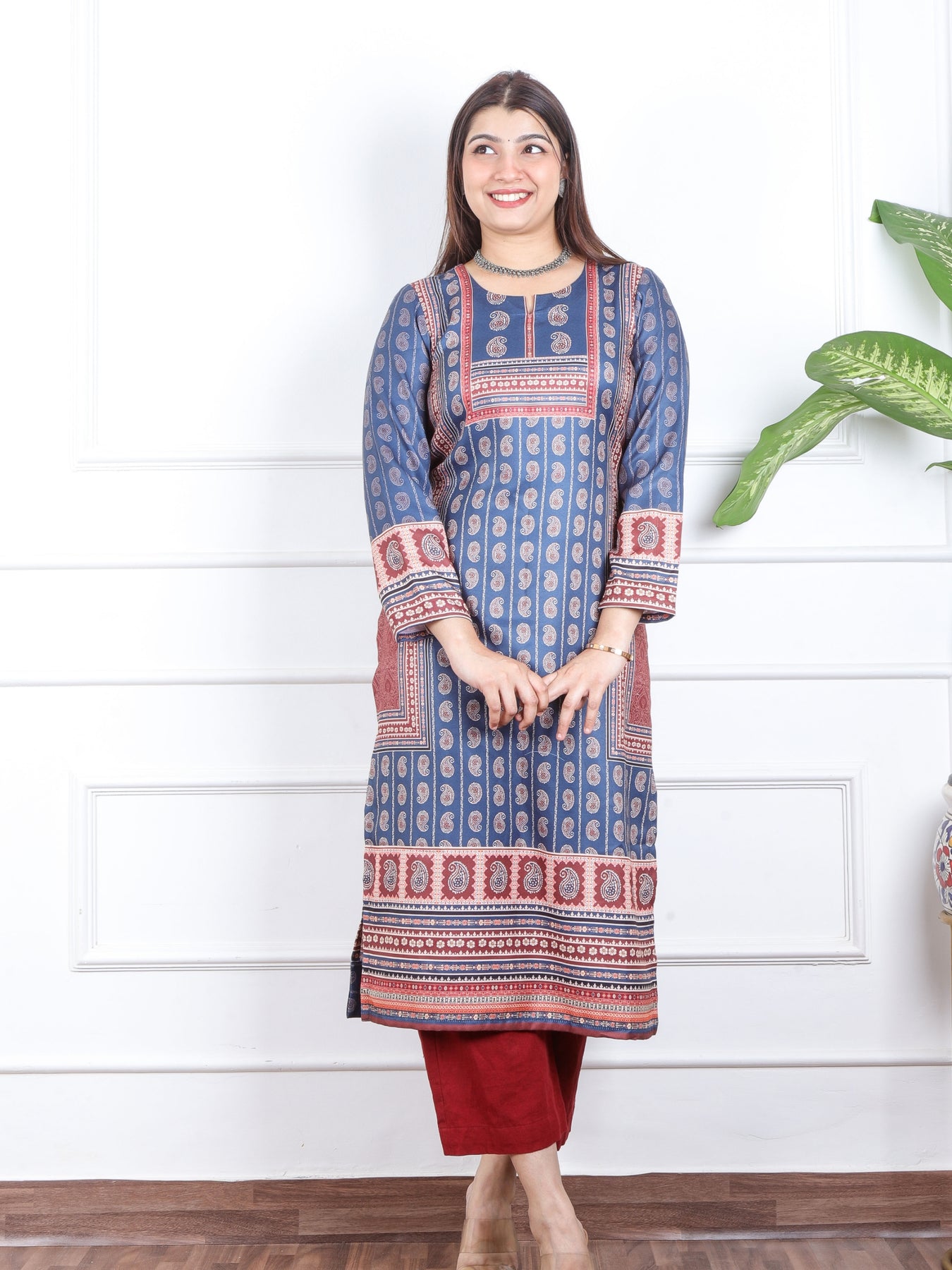 Royal Blue Ajrak Placement Print Semi Pashmina Winter Kurti