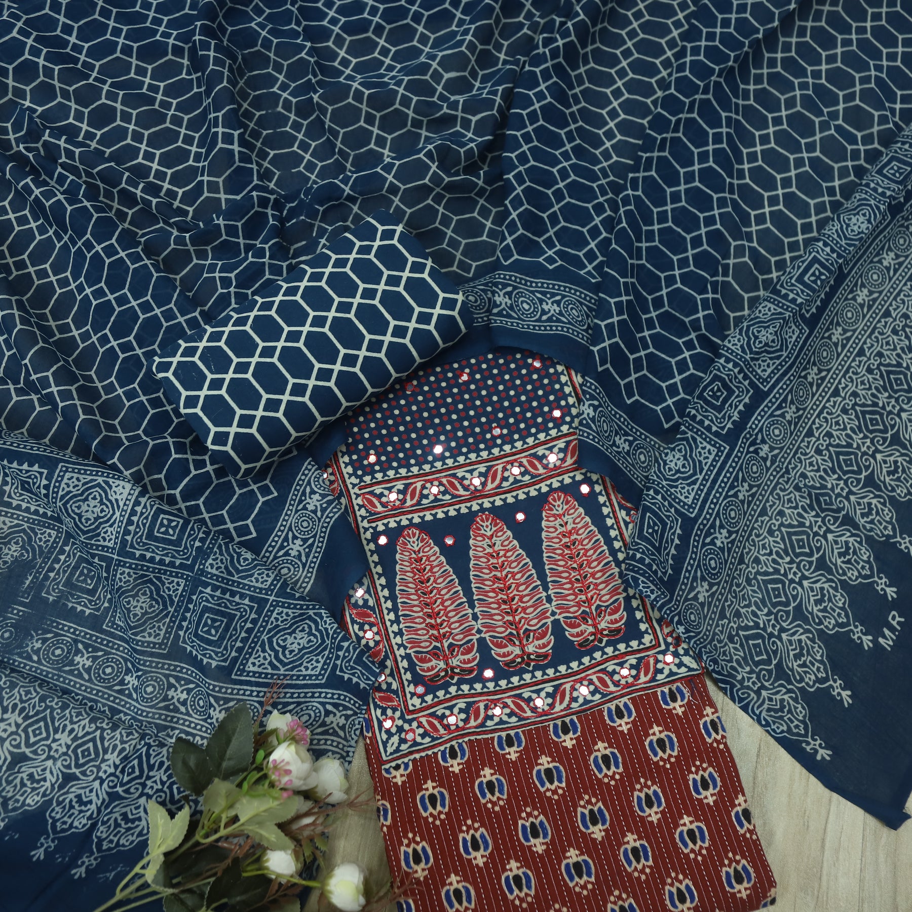 Description- Introducing our Ajrak Work Printed Cotton Top, showcasing intricate mirror work along the neckline. Paired flawlessly with a Printed Cotton Dupatta, this ensemble seamlessly blends traditional artistry with modern design.