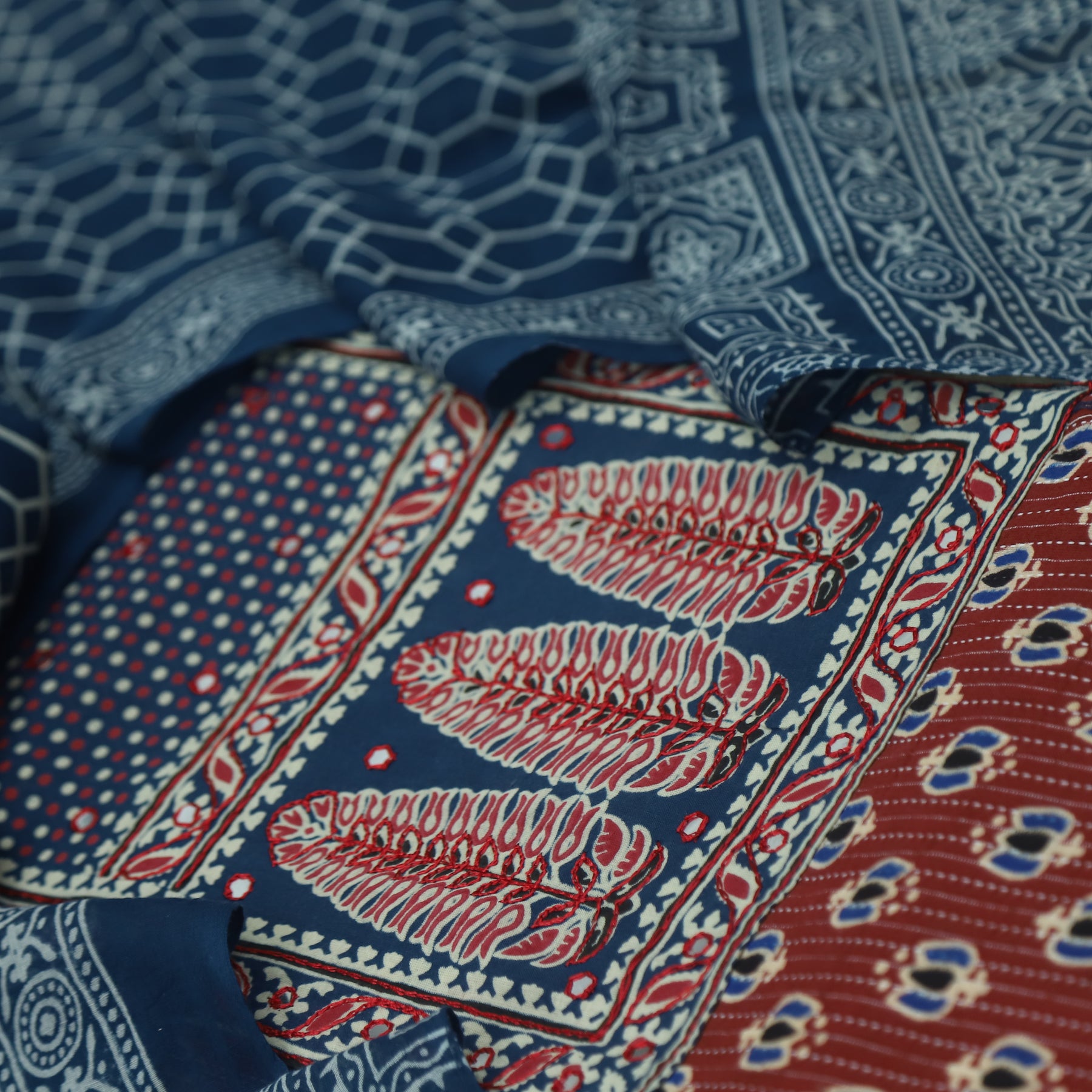 Noorani Brick Red Ajrak Patch with Mirror Work Cotton Suit Set