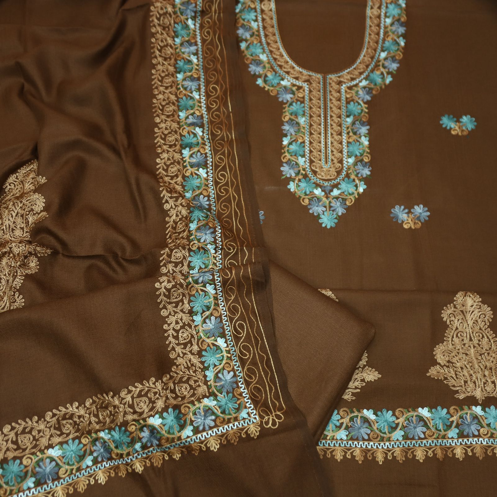 भानुशी Coffee Brown Elegant Woven Kashida Embroidery Semi Pashmina Winter Set