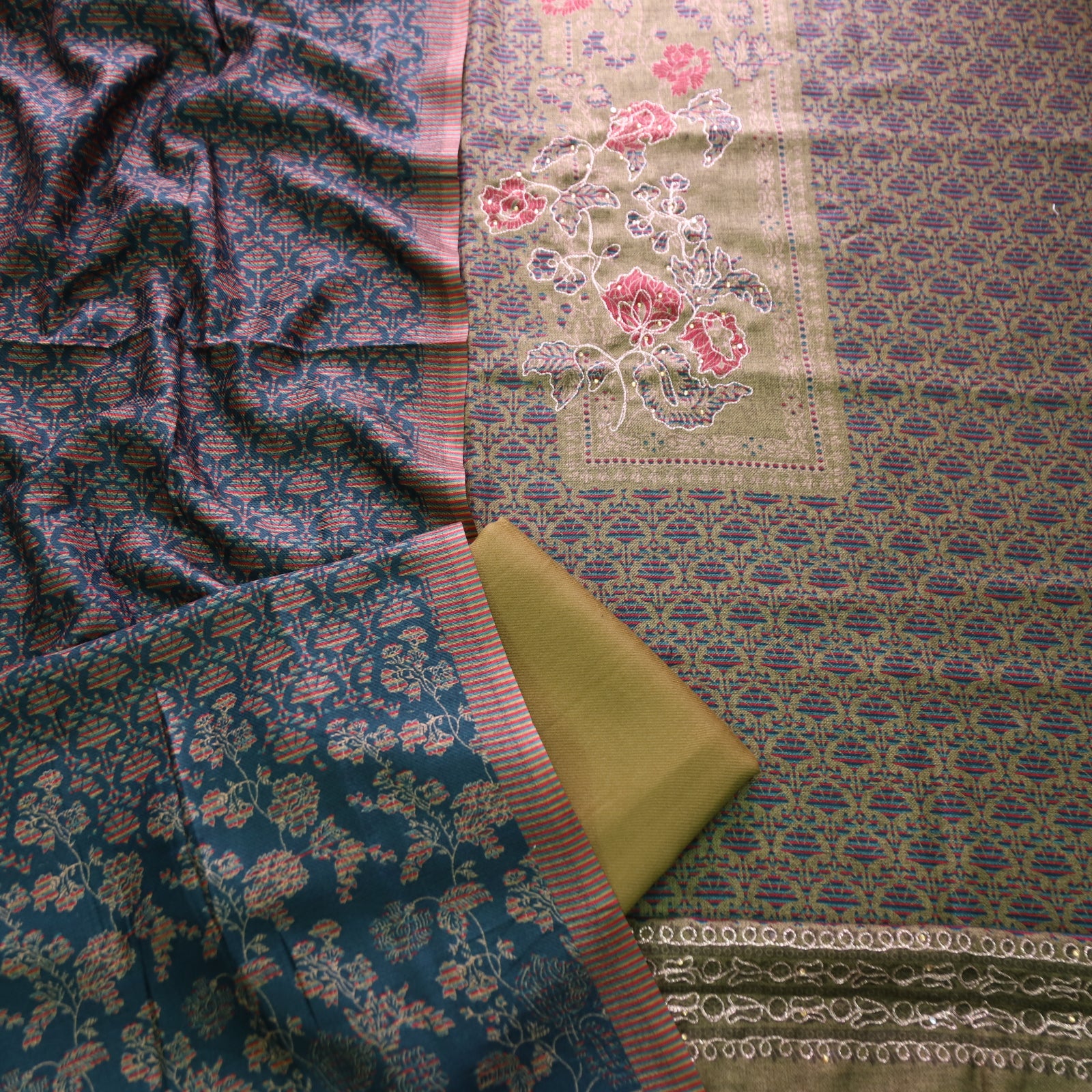 WORK- Experience timeless grace with this Semi Pashmina Suit Set, beautifully crafted with chain-style zari work and intricate floral printed detailing. The warm rust and deep red tones blend harmoniously, creating a perfect balance of elegance and tradition. The semi pashmina fabric offers a soft, cozy texture ideal for winter wear, while the zari embroidery adds a refined shimmer that enhances its festive charm.