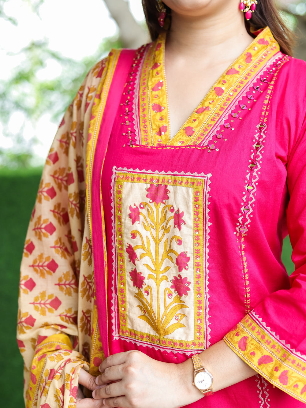 Roohi Bright Pink V Neck Floral Patch with Mirror Work Panel Style Cotton 3 Piece Set