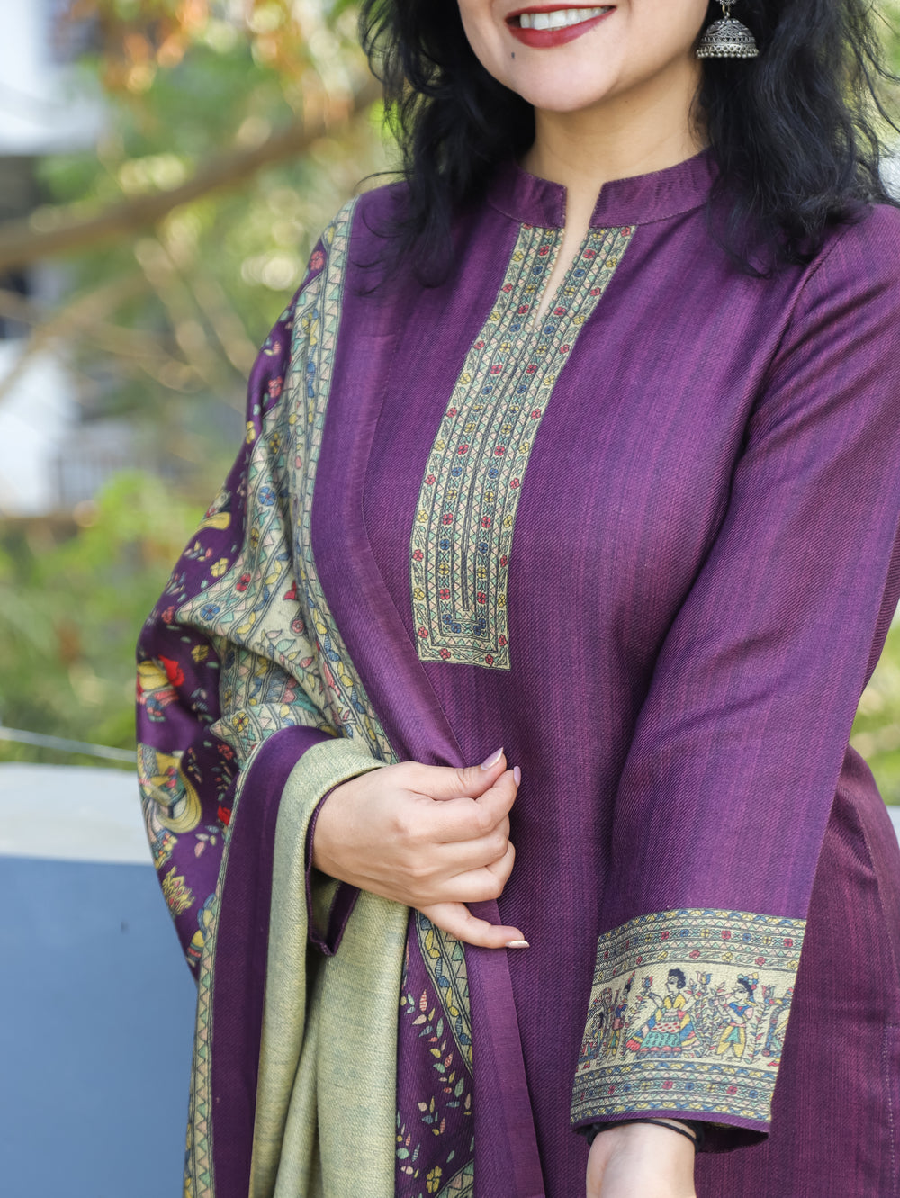 Roshni Violet Purple Ban Collar Madhubani Digital Print Winter Semi Pashmina 3 Piece Set